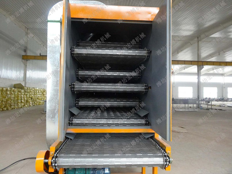 宏博公司生產的網帶式烘干機,是穿流連續式干燥設備,用于透氣性較好的片狀、條狀、顆粒狀物料的干燥,對于脫水蔬菜、中藥飲片等類含水率高、而溫度不允許高的物料尤為合適;設備采用高溫抗拉鋼絲網帶,熱風加熱,均勻受熱,具有干燥速度快、蒸發強度高、產品質量好的優點,對脫水濾餅狀的膏狀物料,需經造粒或制成棒狀后亦可干燥。設備配有無極變速機,可根據物料厚度和含水率調整進料進度,從而達到理想的烘干效果。